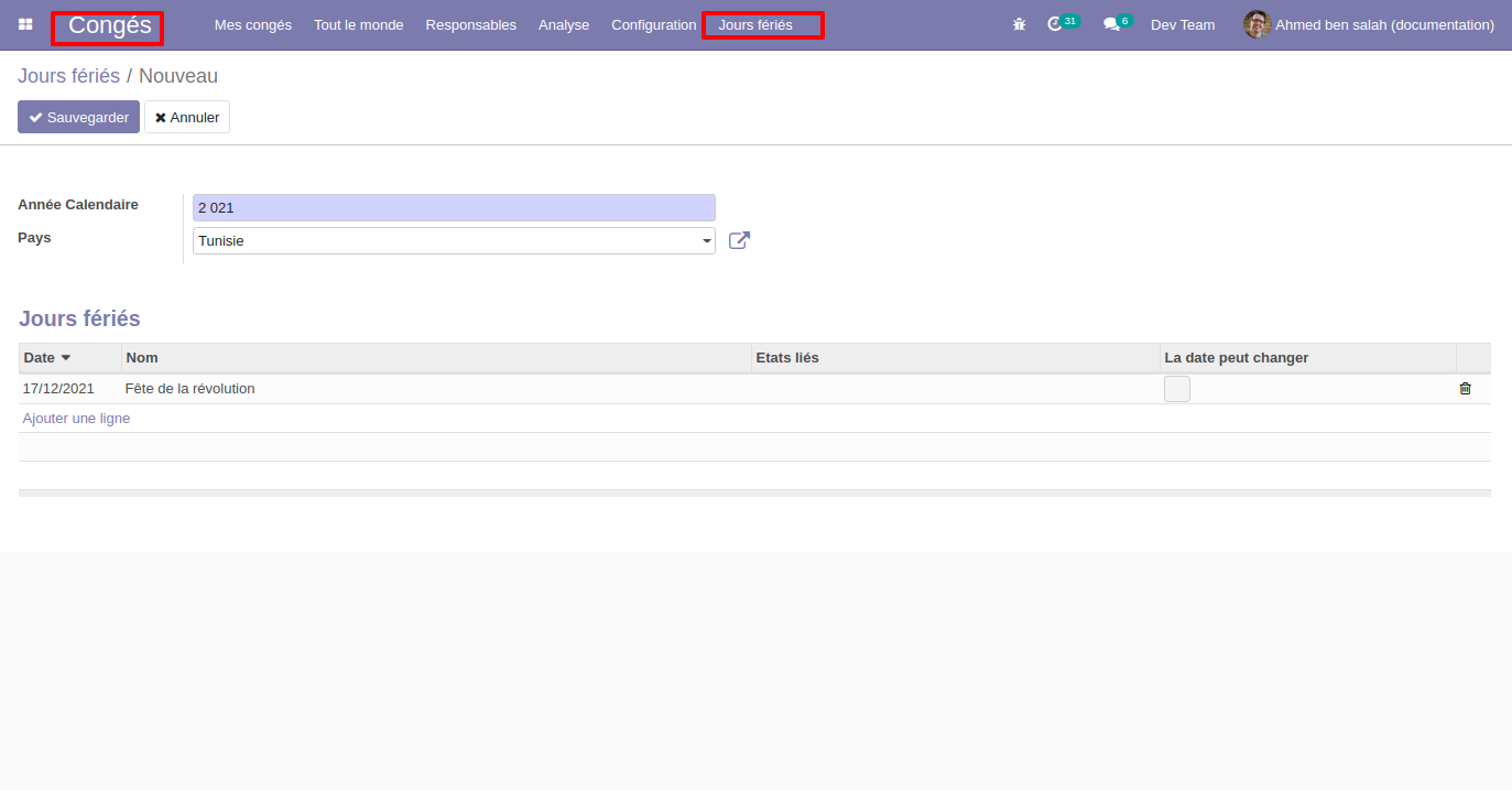 La gestion des jours fériés officiels ou chômés de votre compagnie est traité au sein de systéme sous le menu Congés ‣ Jours fériés