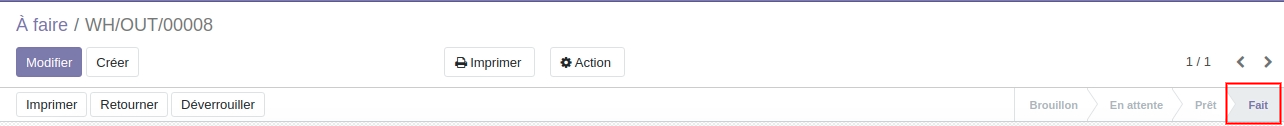 Une fois que vous avez validé le bon de livraison, les produits quittent votre emplacement WH/Stock et sont déplacés vers l’ emplacement du client . Vous pouvez facilement voir que la livraison a eu lieu grâce au statut du document qui est maintenant Terminé .