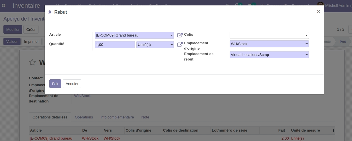 Vous pouvez mettre au rebut les produits qui faisaient partie du reçu à partir de là. Si vous le faites, il les déplacera du stock disponible vers l’emplacement de rebut virtuel.
