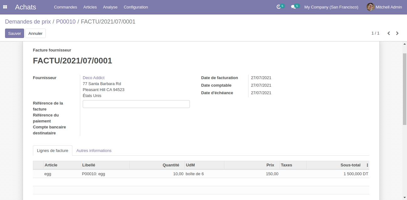 Selon la politique de facturation définie ci-dessus. Si vous êtes censé être facturé en fonction de la quantité commandée, Odoo proposera une facture pour le nombre d’unités commandées. Sinon selon la quantités reçues.